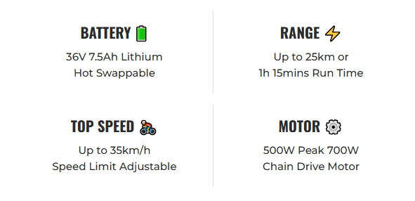 The bike features three-speed modes for all skill levels, including Eco (15 km/h), Low (25 km/h), and Sport (35 km/h), allowing riders of various skill levels to choose their preferred pace.