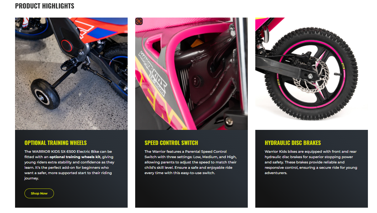 The WARRIOR SX-E500 Electric Bike is not just a ride, it's an adventure waiting to happen. Get your young explorer on the path to electric mobility, learning balance, control, and having a blast while doing it!