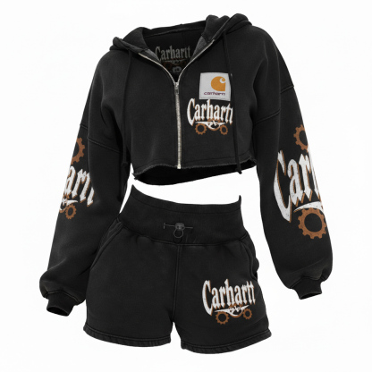 Western Retro Pattern Zipper Hoodie Shorts Washed Set